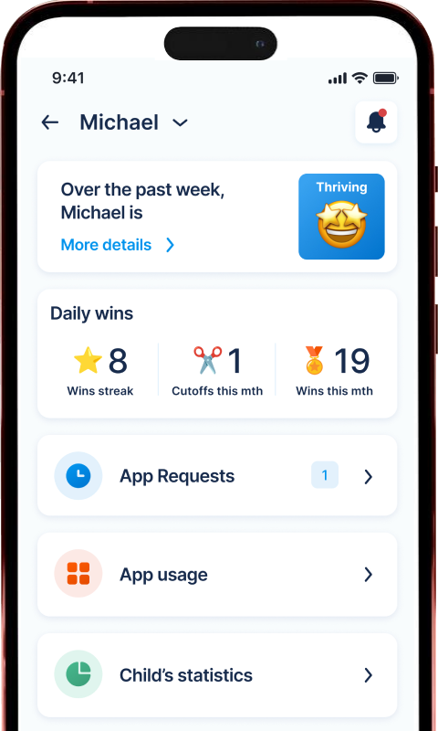 Hit the limit? Cutoff triggers, parent gets notified, and tomorrow’s time shrinks. Stay under? Win the day, build a streak, and earn screen-time growth.