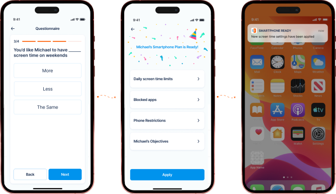Based on your responses, we create a tailored screen-time progression path — selecting the right level and starter limits.